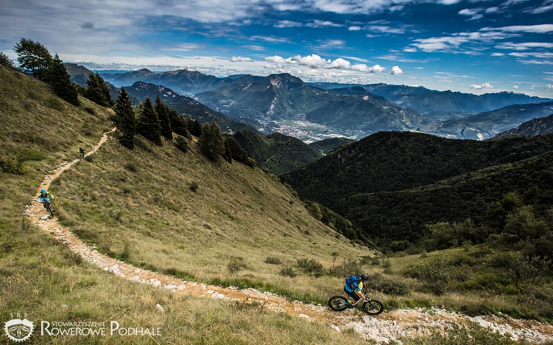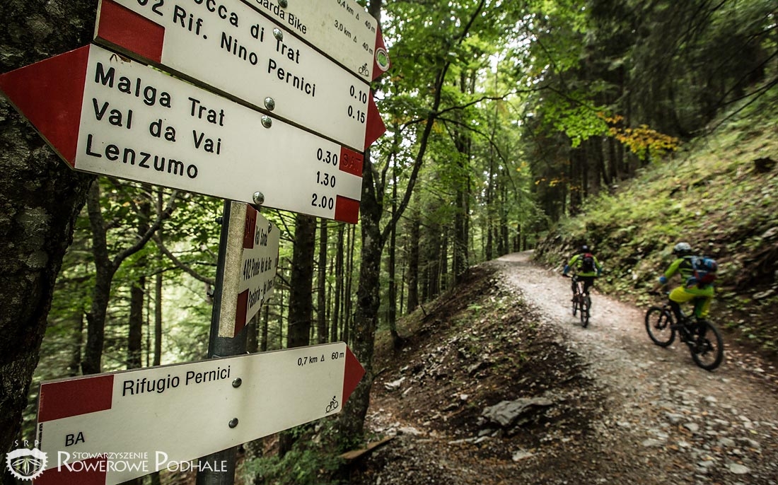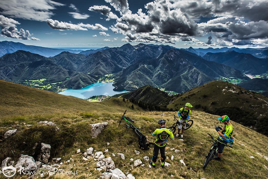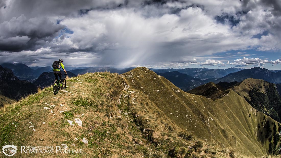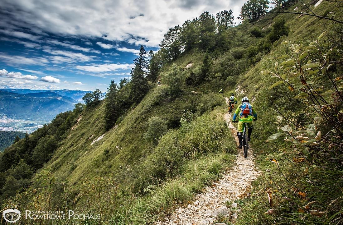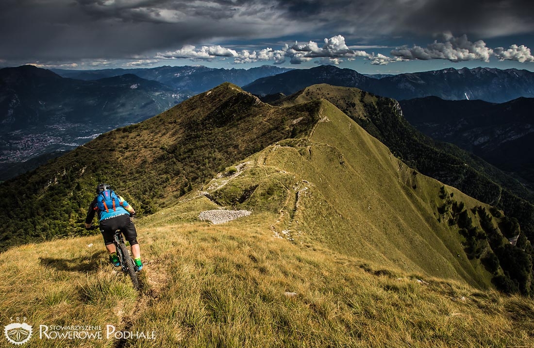 Mezzolago (Lago di Ledro) - Lenzumo - Rif. Nino Pernici - Bocca Saval - Cima Pari - Bocca Dromae - Mezzolago [gpx]. Trasa trudna, miejscami bardzo trudna, ale widoki nieziemskie. Podjazd do schroniska Nino Pernici w większości wiedzie drogą asfaltową, a następnie przechodzi w drogę szutrowo kamienistą. Trawers do przełęczy Bocca Saval szlakiem 413 jest wymagający (eksponowany teren, miejscami skalne progi i duże kamienie). Z przełęczy na szczyt Cima Pari to głownie wypychanie roweru lub wynoszenie go na plecach. W planie mieliśmy zaliczenie całe grani od Cima Pari do Bocca Dromae, ale grań ta jest dosyć trudna, mało płynna i eksponowana, więc zrezygnowaliśmy z tego pomysłu (po zjeździe z Cima Pari przecięliśmy przez krzaki do szlaku 413, który od Bocca Saval jest stosunkowo łatwy). Podsumowując, najlepszą opcją będzie zjazd z Cima Pari z powrotem na przełęcz Bocca Saval i stąd kontynuacja jazdy szlakiem 413 aż do Bocca Dromae. Szczyt Cima Pari warto zaliczyć m.in. ze względu na przepiękną panoramę!