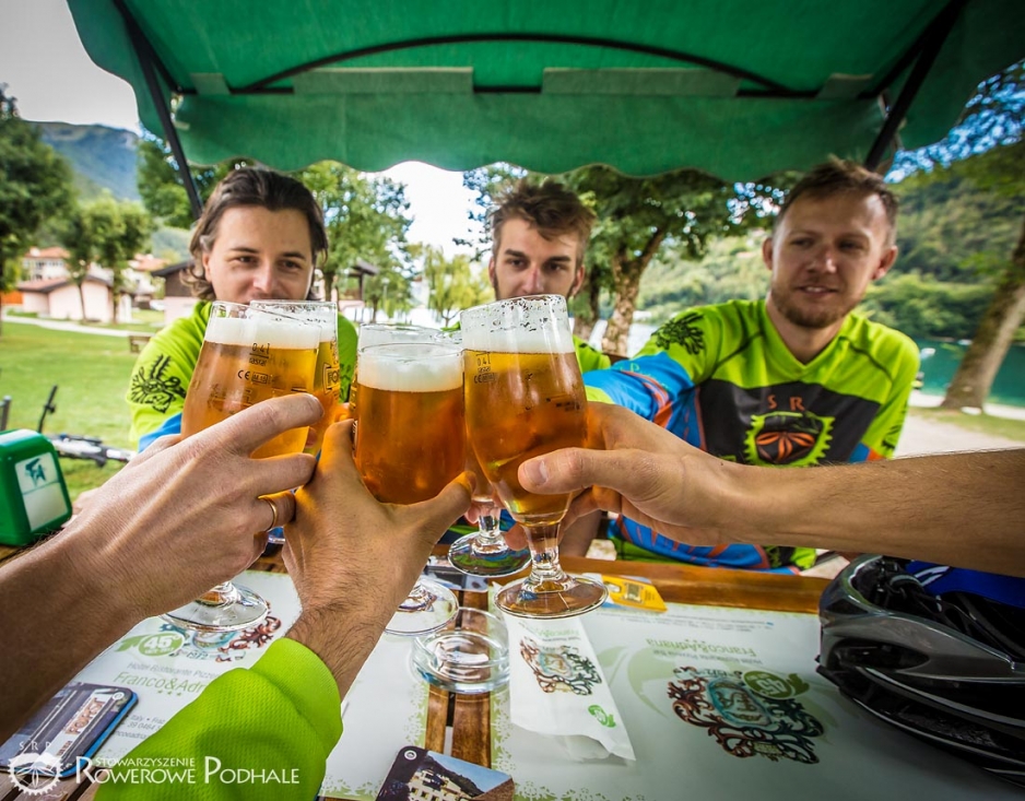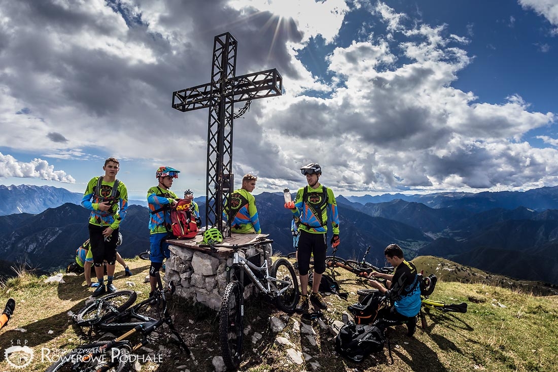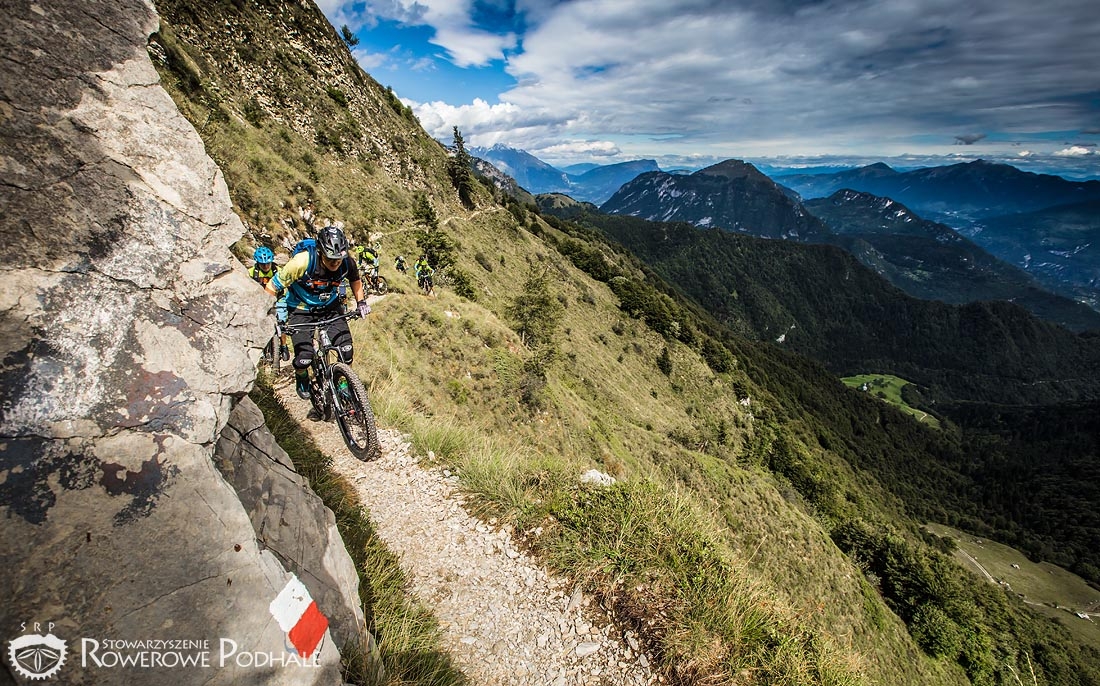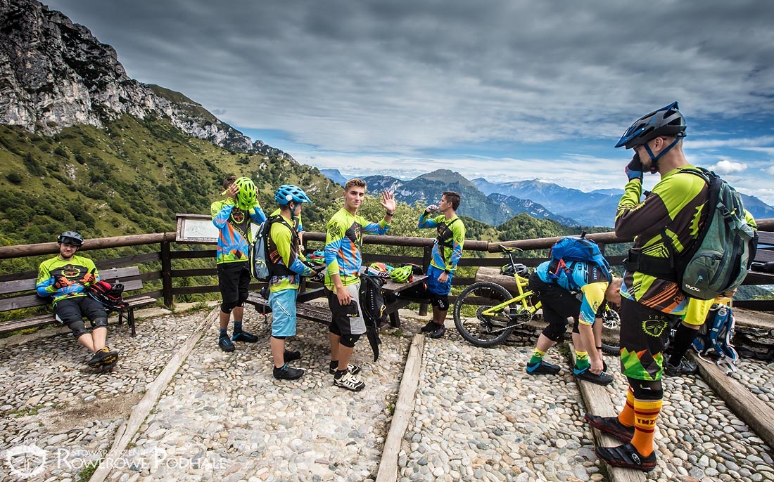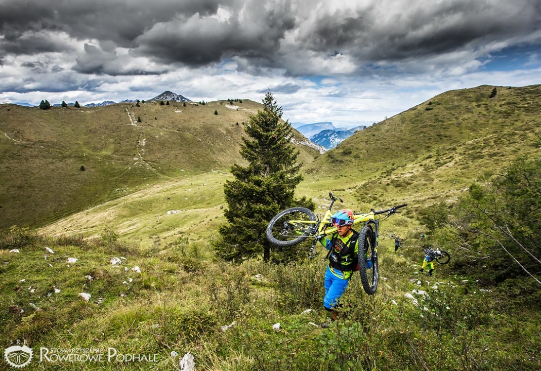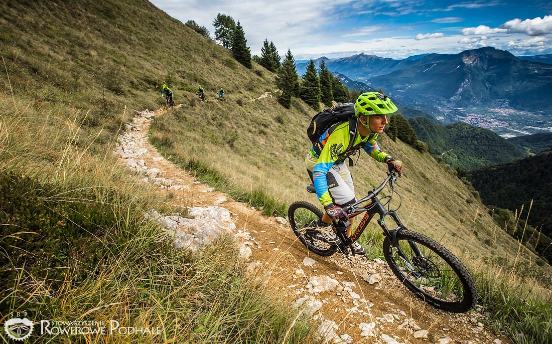Mezzolago (Lago di Ledro) - Lenzumo - Rif. Nino Pernici - Bocca Saval - Cima Pari - Bocca Dromae - Mezzolago [gpx]. Trasa trudna, miejscami bardzo trudna, ale widoki nieziemskie. Podjazd do schroniska Nino Pernici w większości wiedzie drogą asfaltową, a następnie przechodzi w drogę szutrowo kamienistą. Trawers do przełęczy Bocca Saval szlakiem 413 jest wymagający (eksponowany teren, miejscami skalne progi i duże kamienie). Z przełęczy na szczyt Cima Pari to głownie wypychanie roweru lub wynoszenie go na plecach. W planie mieliśmy zaliczenie całe grani od Cima Pari do Bocca Dromae, ale grań ta jest dosyć trudna, mało płynna i eksponowana, więc zrezygnowaliśmy z tego pomysłu (po zjeździe z Cima Pari przecięliśmy przez krzaki do szlaku 413, który od Bocca Saval jest stosunkowo łatwy). Podsumowując, najlepszą opcją będzie zjazd z Cima Pari z powrotem na przełęcz Bocca Saval i stąd kontynuacja jazdy szlakiem 413 aż do Bocca Dromae. Szczyt Cima Pari warto zaliczyć m.in. ze względu na przepiękną panoramę!