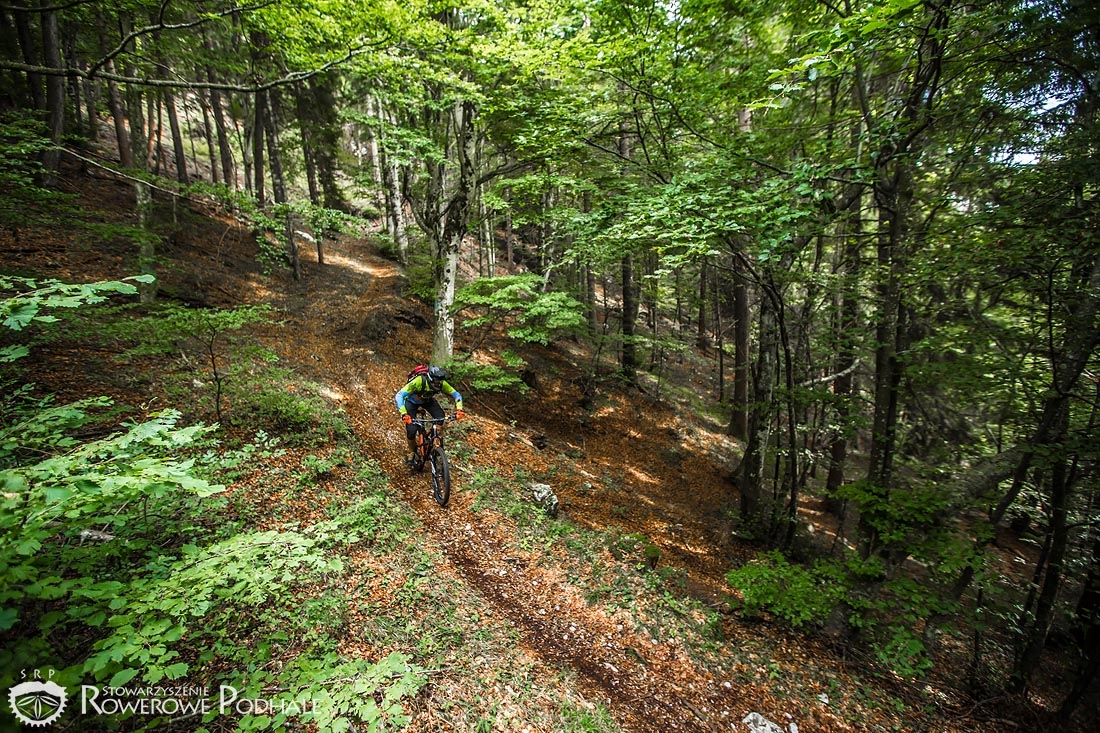 Z przełęczy Bocca Dromae najpierw szlakiem 453 (trawa, koleiny, luźne kamienie), a następnie szutrówką do początku singla na którym już częściej spotykamy kamienie przytwierdzone do gruntu, trochę ściółki i korzeni. Im niżej tym mniej luźnego materiału, a ostatnie segmenty zjazdu to piękny leśny singielek miejscami wijący się malowniczymi jarami.